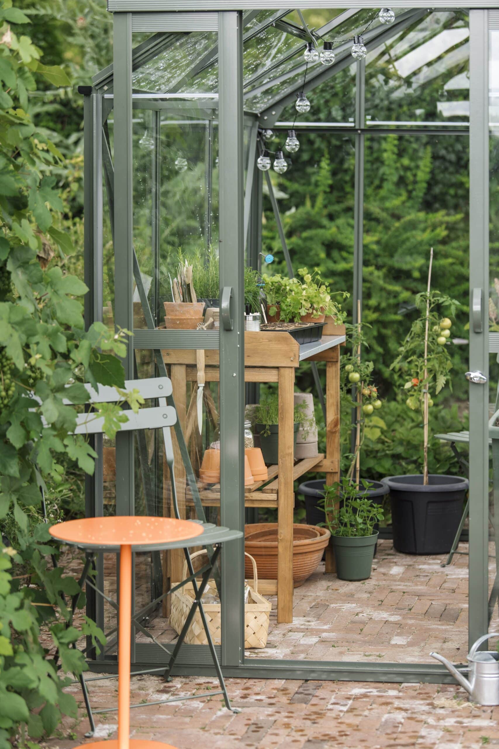Das Gewächshaus Anne I in Grün-Grau ist in der Farbe Grün-Grau (RAL 7009) ausgeführt und wird komplett inklusive 3-mm-Sicherheitsglas und Fundament geliefert. Die Profile haben eine elegante, matte Oberfläche. Das Gewächshaus Anne I ist auch in Schwarz (RAL 9005) erhältlich.