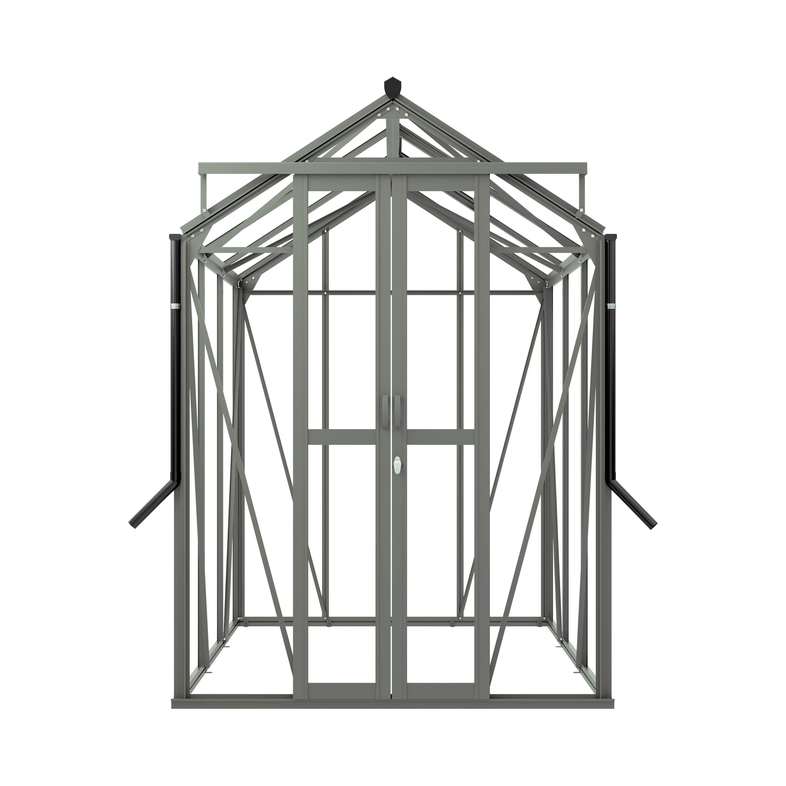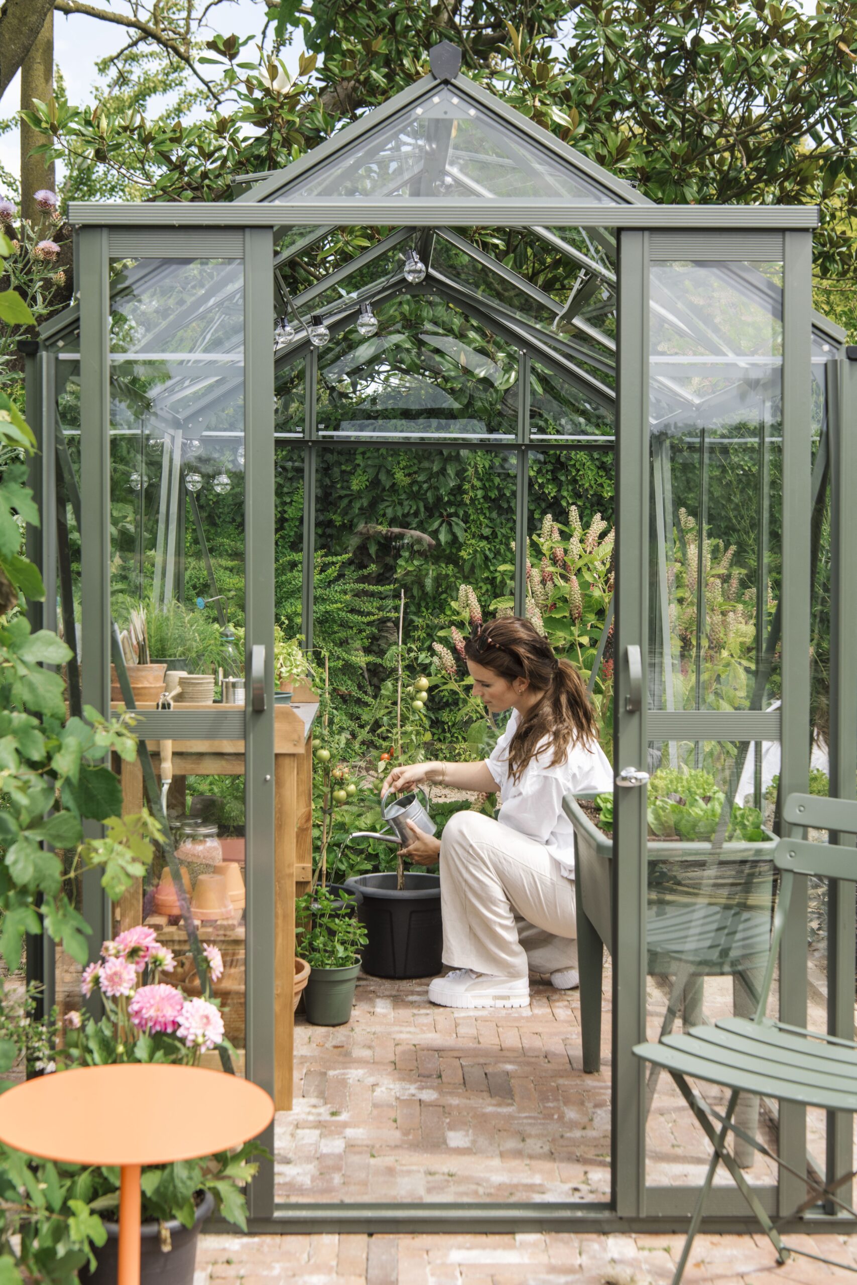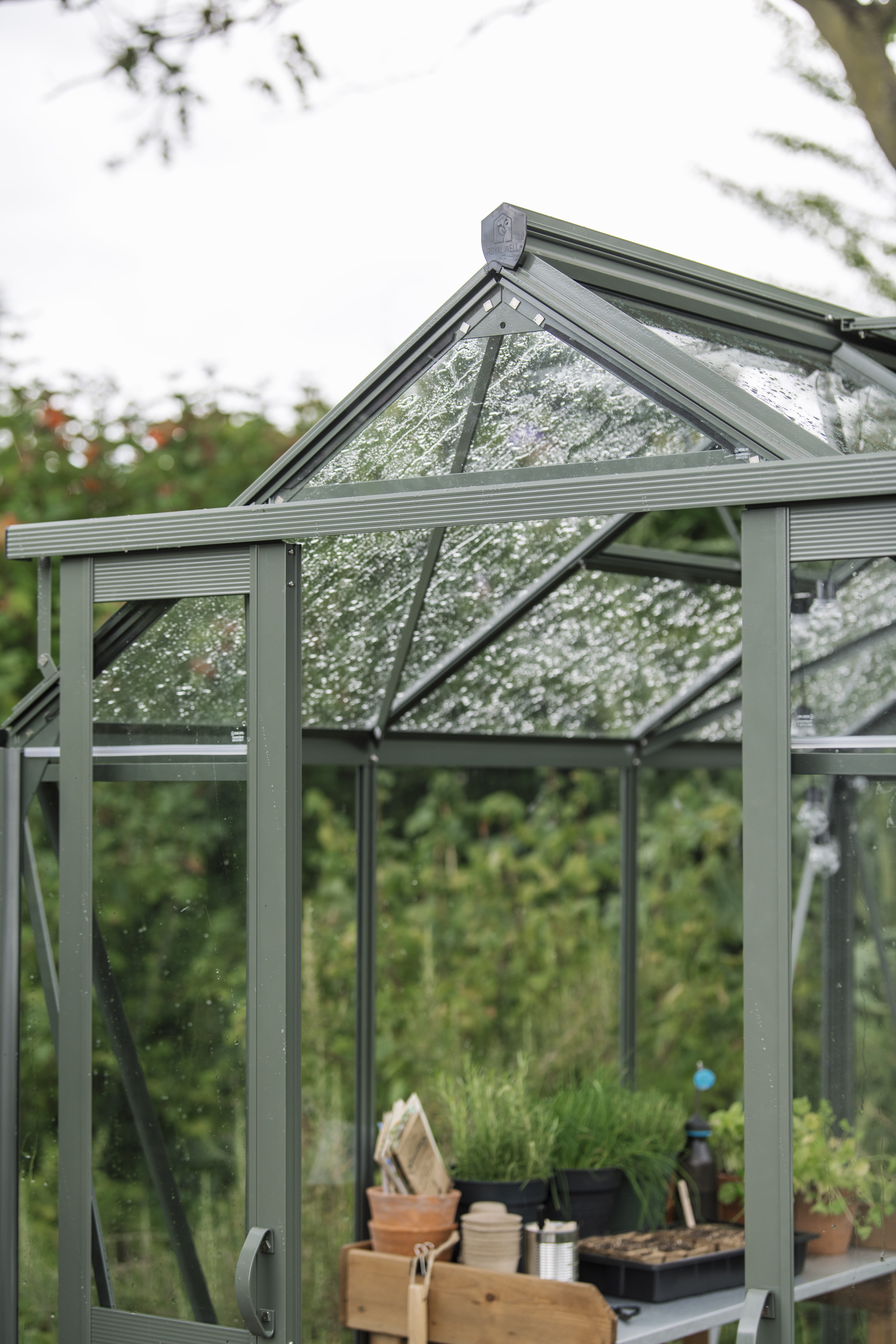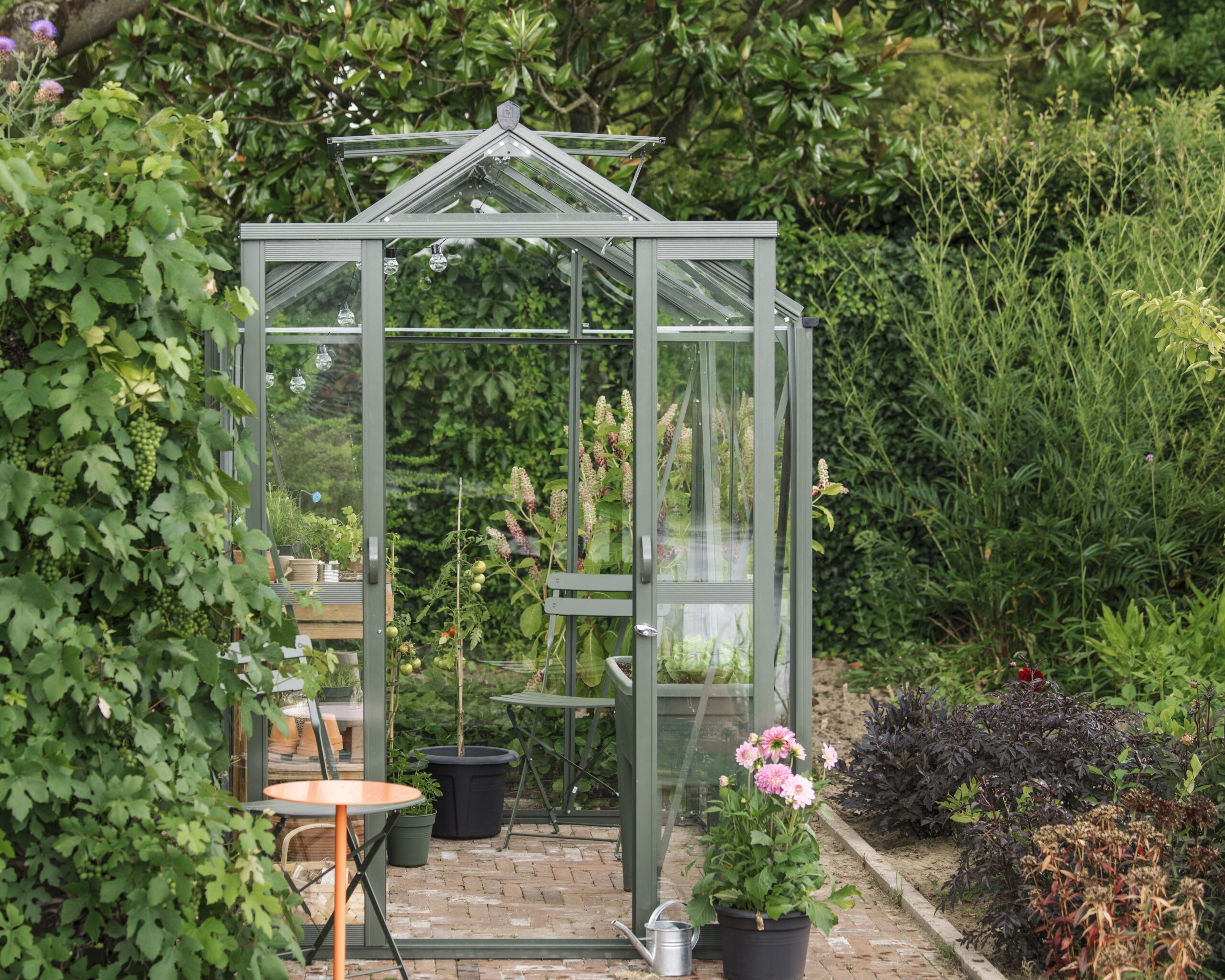 Das Gewächshaus Anne II in Grün-Grau ist in der Farbe Grün-Grau (RAL 7009) ausgeführt und wird komplett inklusive 3 mm Sicherheitsglas und Fundament geliefert. Die Profile haben eine elegante, matte Oberfläche. Das Gewächshaus Anne II ist auch in Schwarz (RAL 9005) erhältlich.