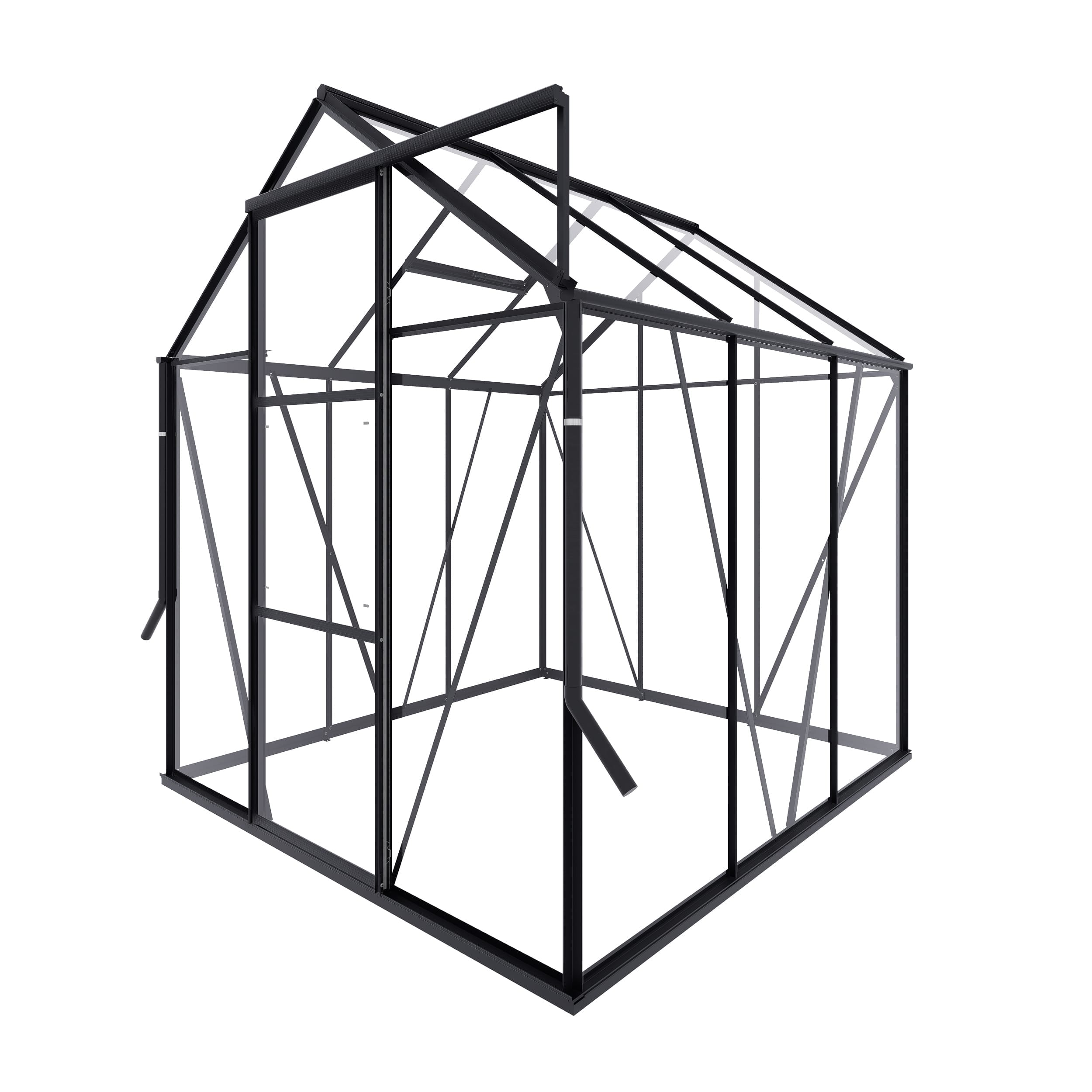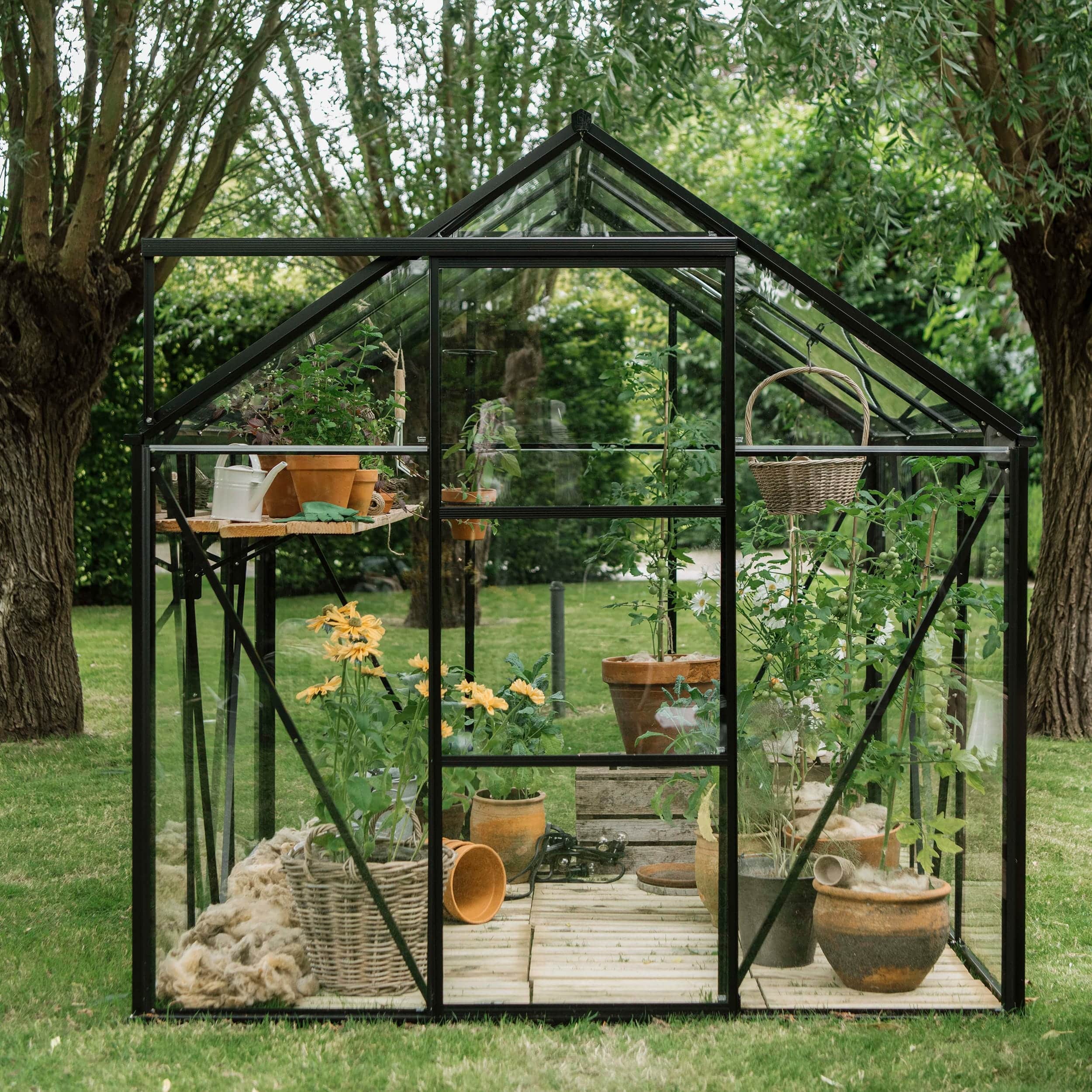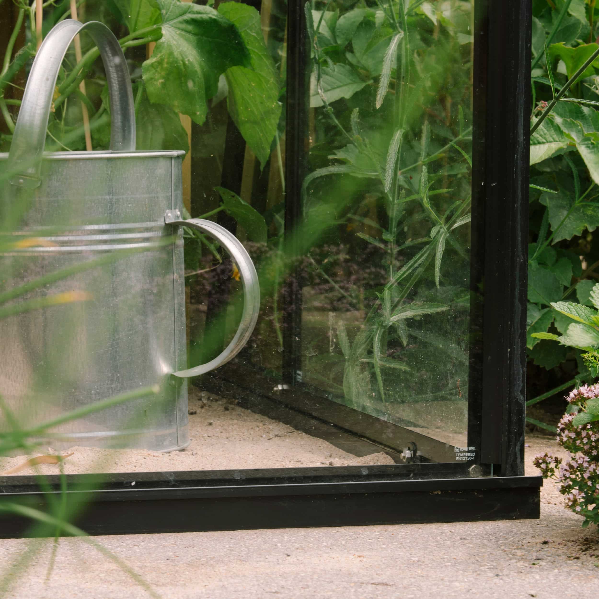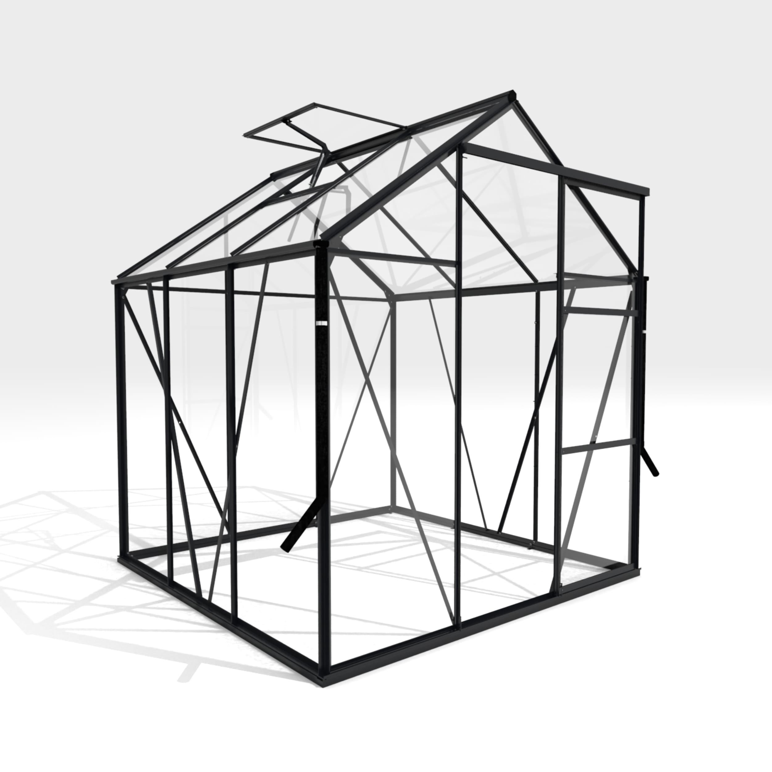 Dieses Gewächshaus ist in Schwarz (RAL 9005) gehalten und hat eine Fläche von ca. 3,7 m². Das 3 mm dicke Sicherheitsglas wird auf der Innenseite mit dämpfendem Schaumstoffband fest befestigt. Auf der Außenseite wird das Glas mit PVC-Verglasungsleisten versehen. Diese lassen sich einfach anbringen und sind in der Farbe der Profile gehalten. Die Profile haben eine elegante, matte Oberfläche. Das Gewächshaus Kate I ist auch in den Farben Weiß (RAL 9010) und Graugrün (RAL 7009) erhältlich.