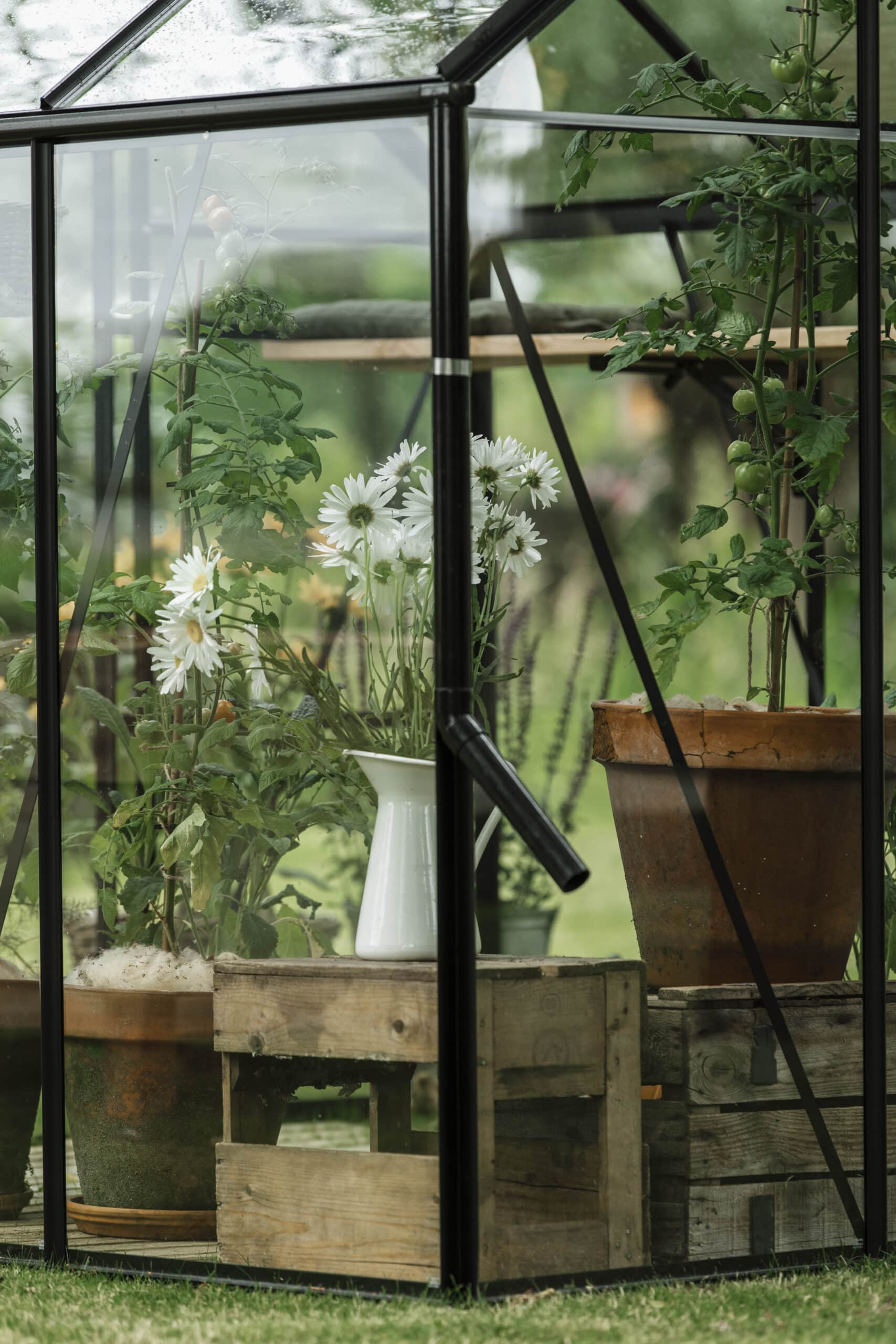 Das Gewächshaus Kate I Schwarz ist mit einem Dachfenster ausgestattet, das über einen Kipphebel verfügt. Optional ist auch ein automatischer Fensteröffner erhältlich. Dieser öffnet das Fenster automatisch auf Basis des stufenlos einstellbaren Temperaturreglers. So werden deine Pflanzen auch belüftet, wenn du nicht in der Nähe bist. Mit einer Firsthöhe von 211 cm bietet dieses Gewächshaus eine komfortable Arbeitshöhe, sodass Sie bequem gärtnern können. Außerdem sind praktische Zubehörteile erhältlich, wie Pflanzspiralen, Topfhalter und Anzuchtbehälter.