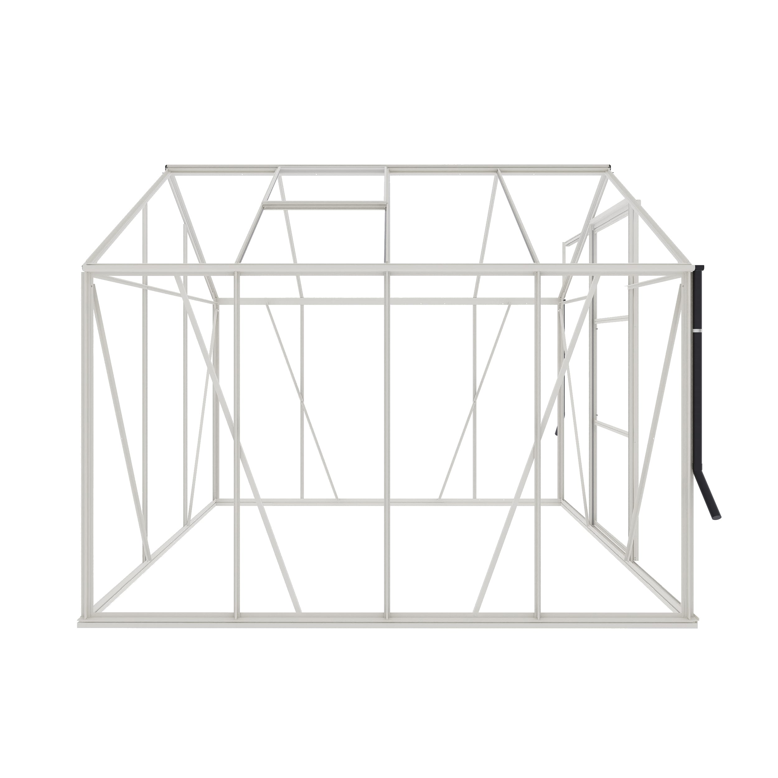 Dieses Gewächshaus ist in Weiß (RAL 9010) gehalten und hat eine Fläche von ca. 4,8 m². Das 3 mm dicke Sicherheitsglas wird auf der Innenseite mit dämpfendem Schaumstoffband fest befestigt. Auf der Außenseite wird das Glas mit PVC-Verglasungsleisten versehen. Diese lassen sich einfach anbringen und sind in der Farbe der Profile gehalten. Die Profile haben eine elegante, matte Oberfläche. Das Gewächshaus Kate II ist auch in den Farben Grün-Grau (RAL 7009) und Schwarz (RAL 9005) erhältlich.