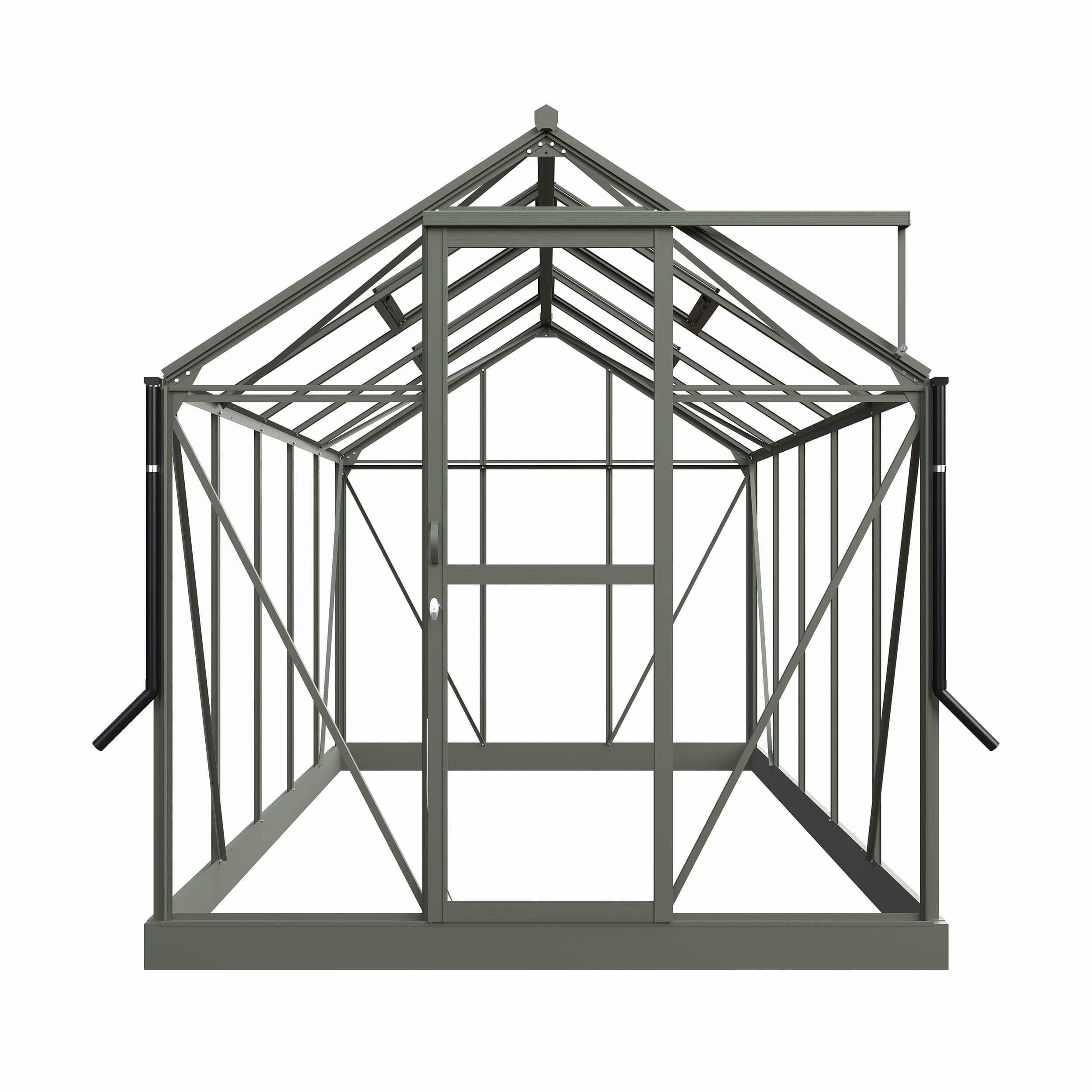 Dieses Gewächshaus ist in der Farbe Graugrün (RAL 7009) ausgeführt und hat eine Fläche von ca. 7,5 m². Das 3 mm dicke Sicherheitsglas wird auf der Innenseite mit dämpfendem Schaumstoffband fest befestigt. Auf der Außenseite wird das Glas mit PVC-Verglasungsleisten versehen. Diese lassen sich einfach anbringen und sind in der Farbe der Profile ausgeführt. Die Profile haben eine elegante, matte Oberfläche. Das Gewächshaus Mary III ist auch in den Farben Schwarz (RAL 9005) und Weiß (RAL 9010) erhältlich.
