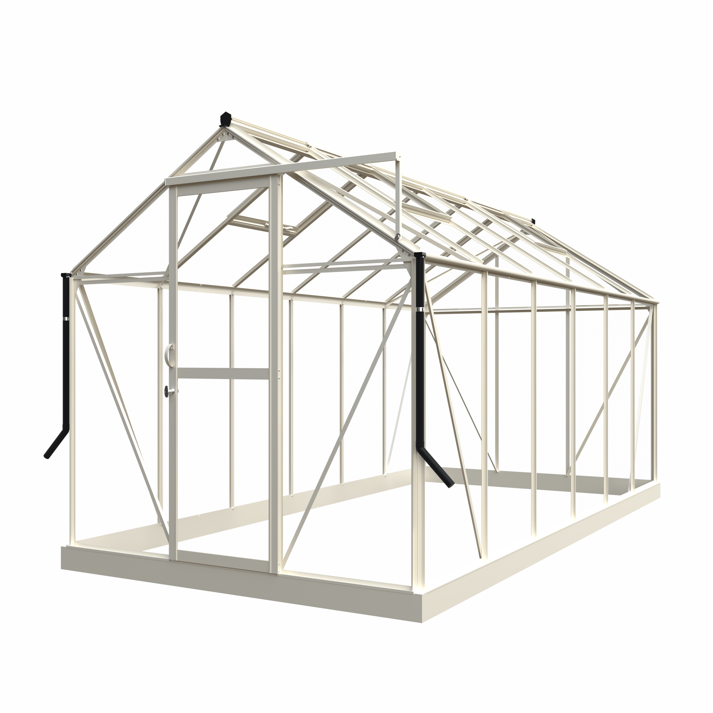 Dieses Gewächshaus ist in der Farbe Weiß (RAL 9010) ausgeführt und hat eine Fläche von ca. 9 m². Das 3 mm dicke Sicherheitsglas wird auf der Innenseite mit dämpfendem Schaumstoffband fest befestigt. Auf der Außenseite wird das Glas mit PVC-Verglasungsleisten versehen. Diese lassen sich einfach anbringen und sind in der Farbe der Profile ausgeführt. Die Profile haben eine elegante, matte Oberfläche. Das Gewächshaus Mary III ist auch in den Farben Schwarz (RAL 9005) und Graugrün (RAL 7009) erhältlich.