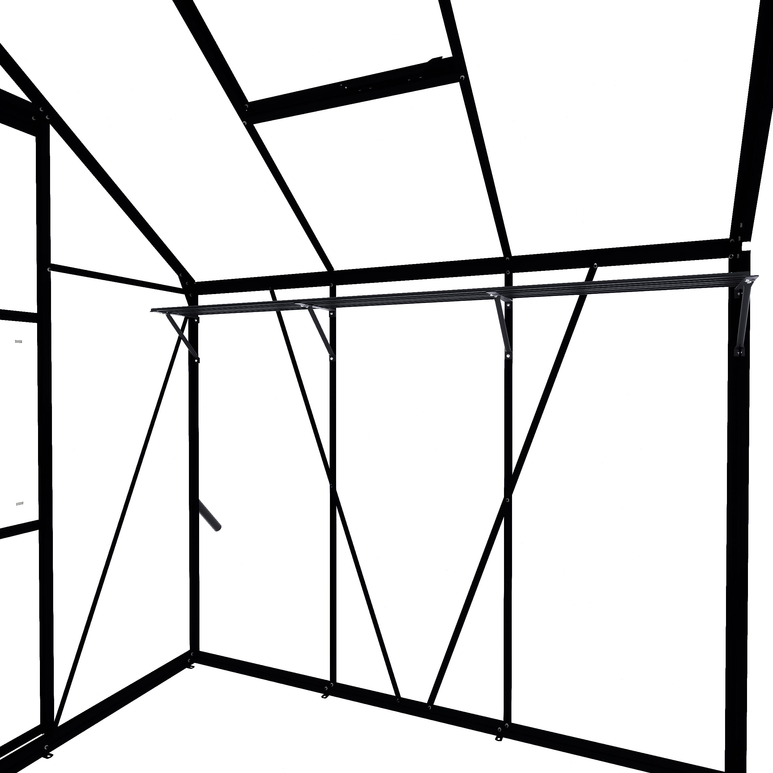 Die Regale sind in Ausführungen mit 2 oder 3 Sektionen erhältlich. Jedes seitliche Fenster entspricht einer Sektion. Beim Gewächshaus Kate I in Schwarz besteht das Regal aus einem Kulturregal mit 3 Sektionen.