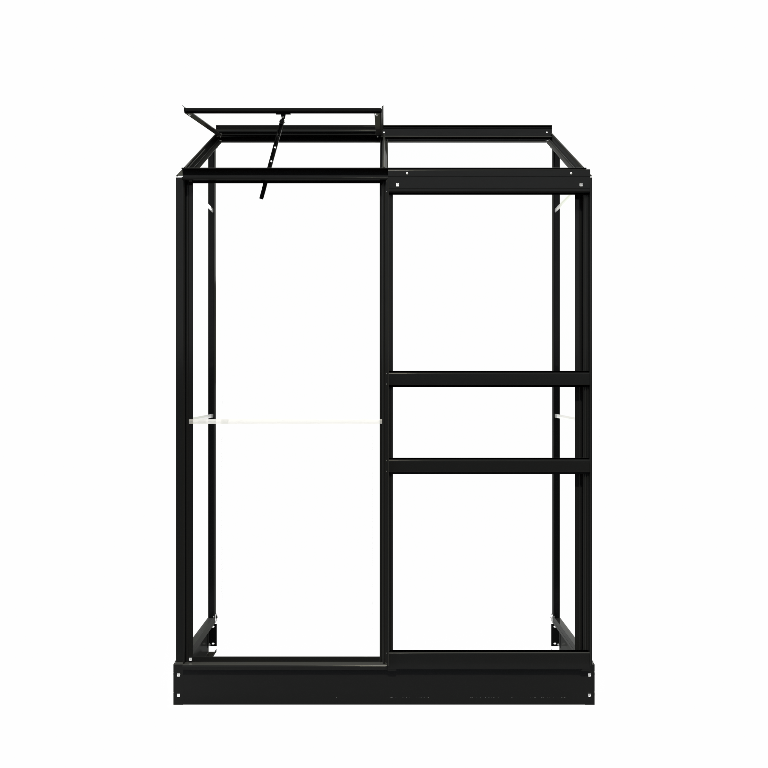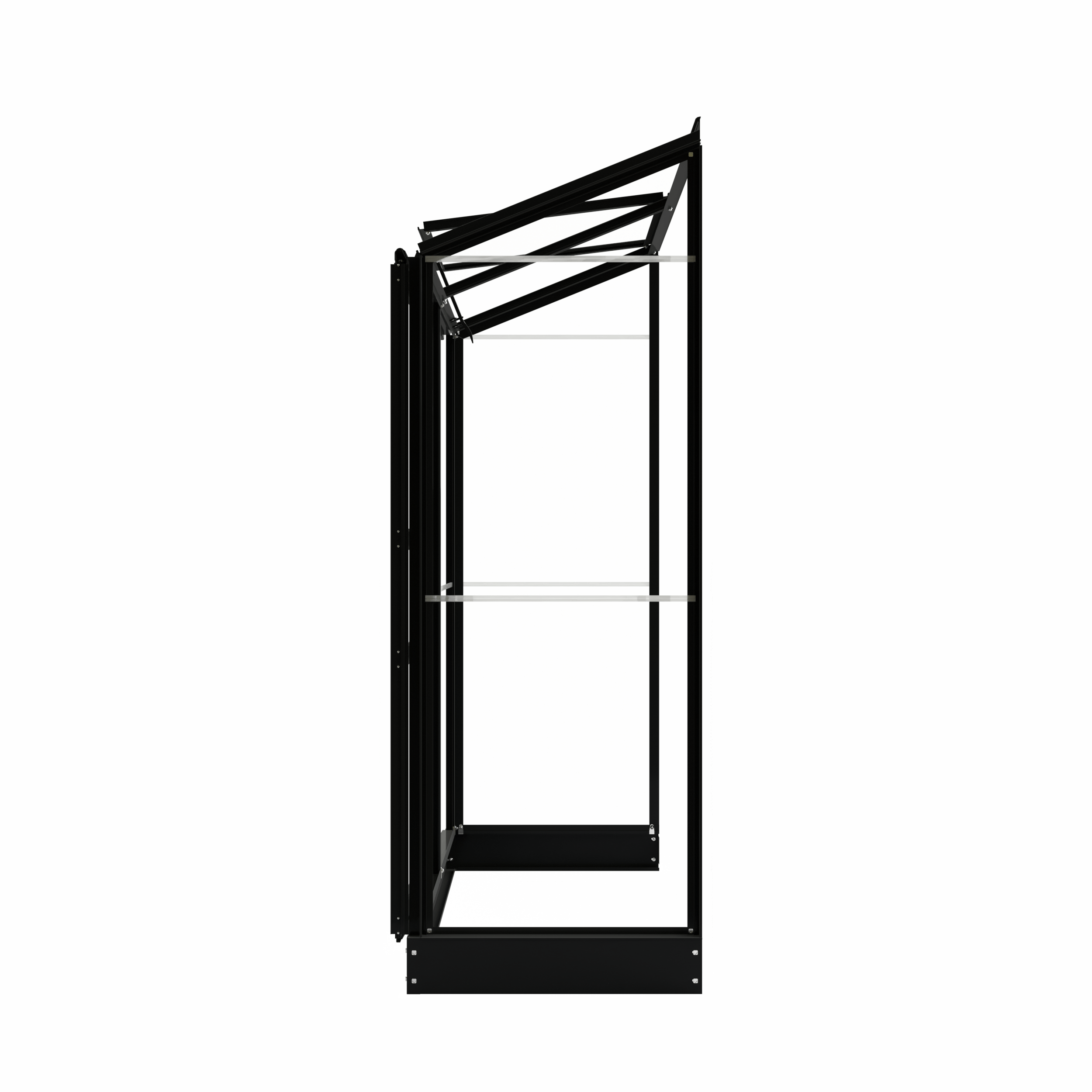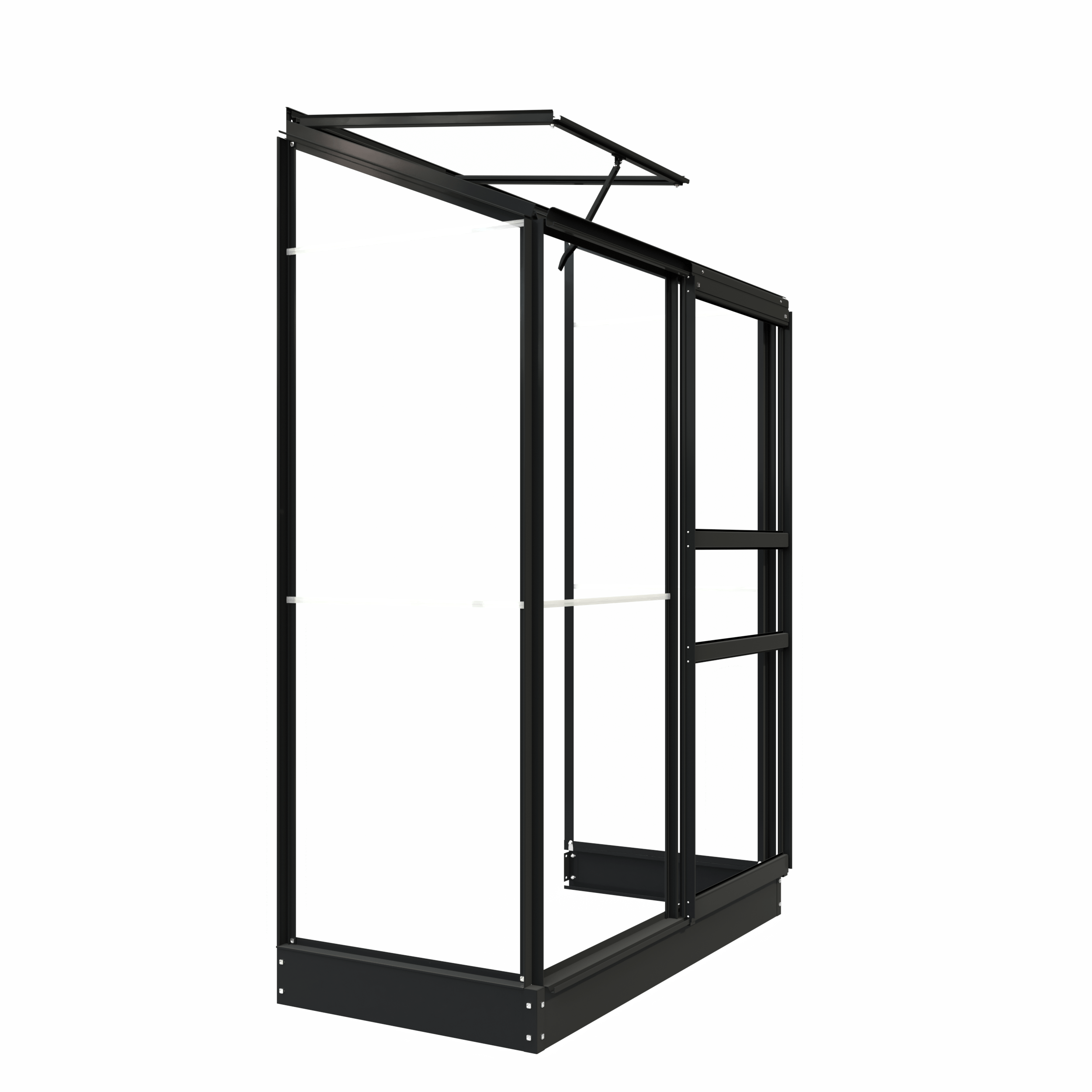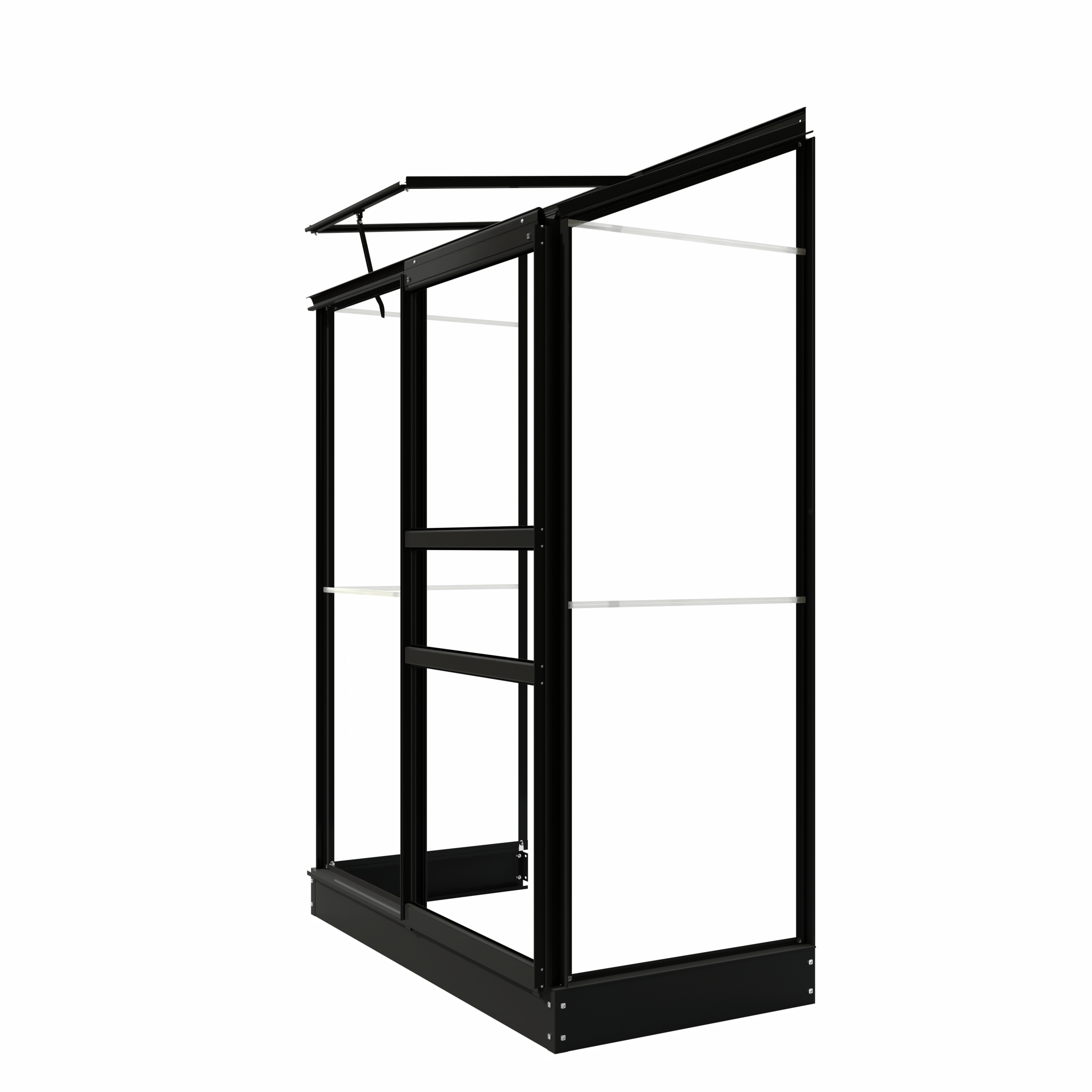This model comes fitted as standard with 3 mm safety glass, which is securely fastened using attractive glazing strips in the same colour as the frame. In addition, this wall greenhouse is supplied with a matching coloured base, providing a solid foundation. The greenhouse features a single sliding door and a roof vent with a venting mechanism, ensuring optimal ventilation. In addition to the black version, the Emma I wall greenhouse is available in green-grey (RAL7009) and white (RAL9010). The profiles have a matt finish.