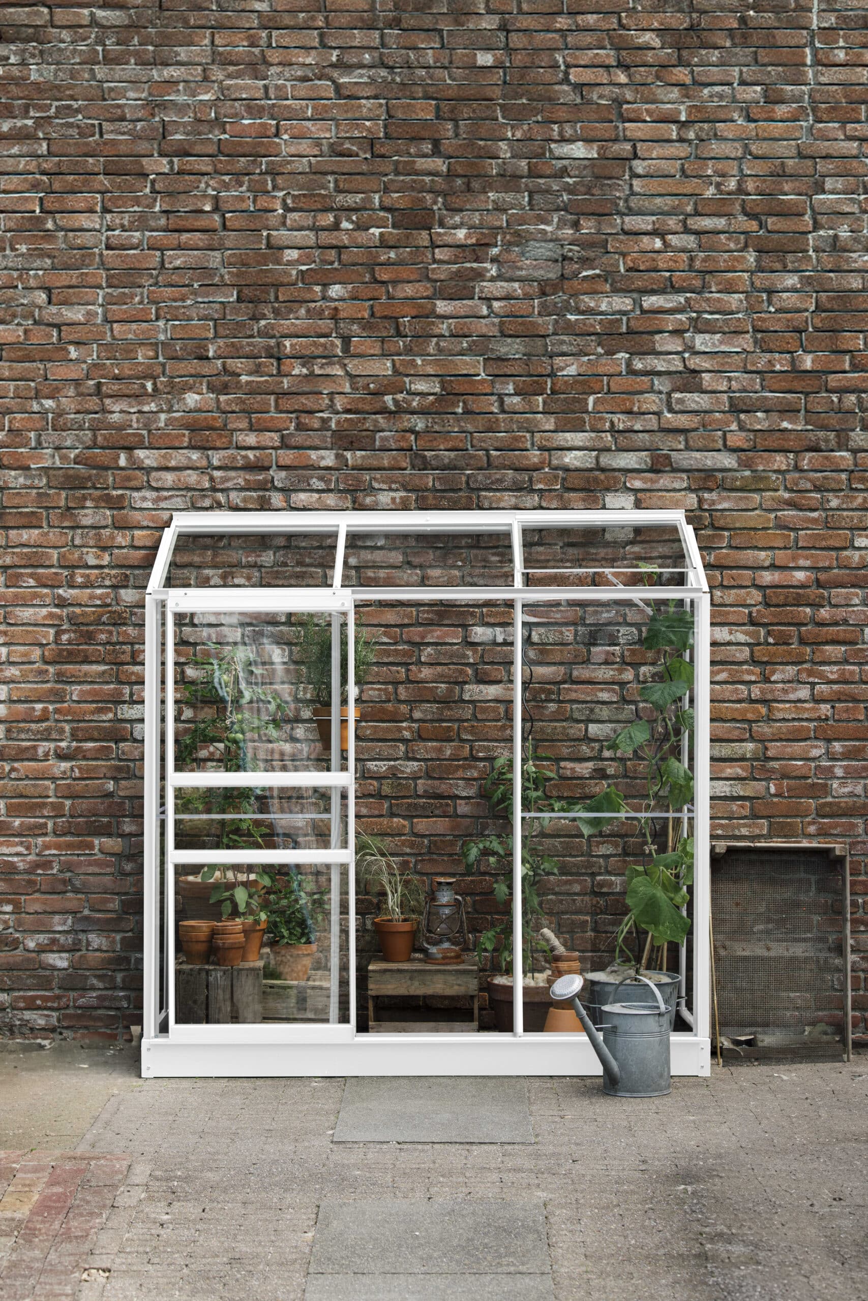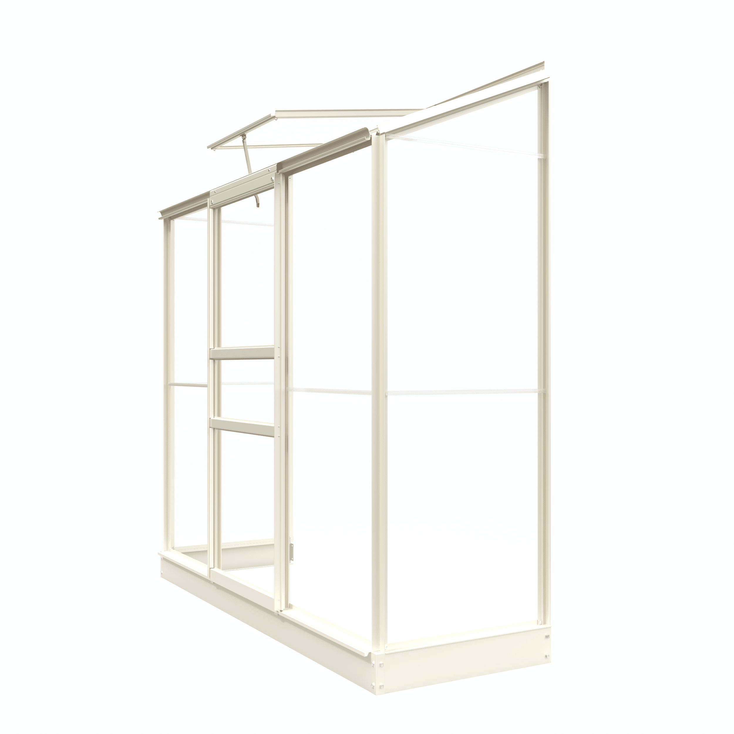 This model comes as standard with 3 mm safety glass, which is securely fixed using attractive glazing strips in the same colour as the frame. In addition, this wall greenhouse is supplied with a matching coloured base, providing a solid foundation. The greenhouse features a centrally positioned single sliding door and a roof vent with a venting mechanism, ensuring optimal ventilation. In addition to the white version, the Emma wall greenhouse is available in green-grey (RAL7009) and black (RAL9005). The profiles have a matt finish.
