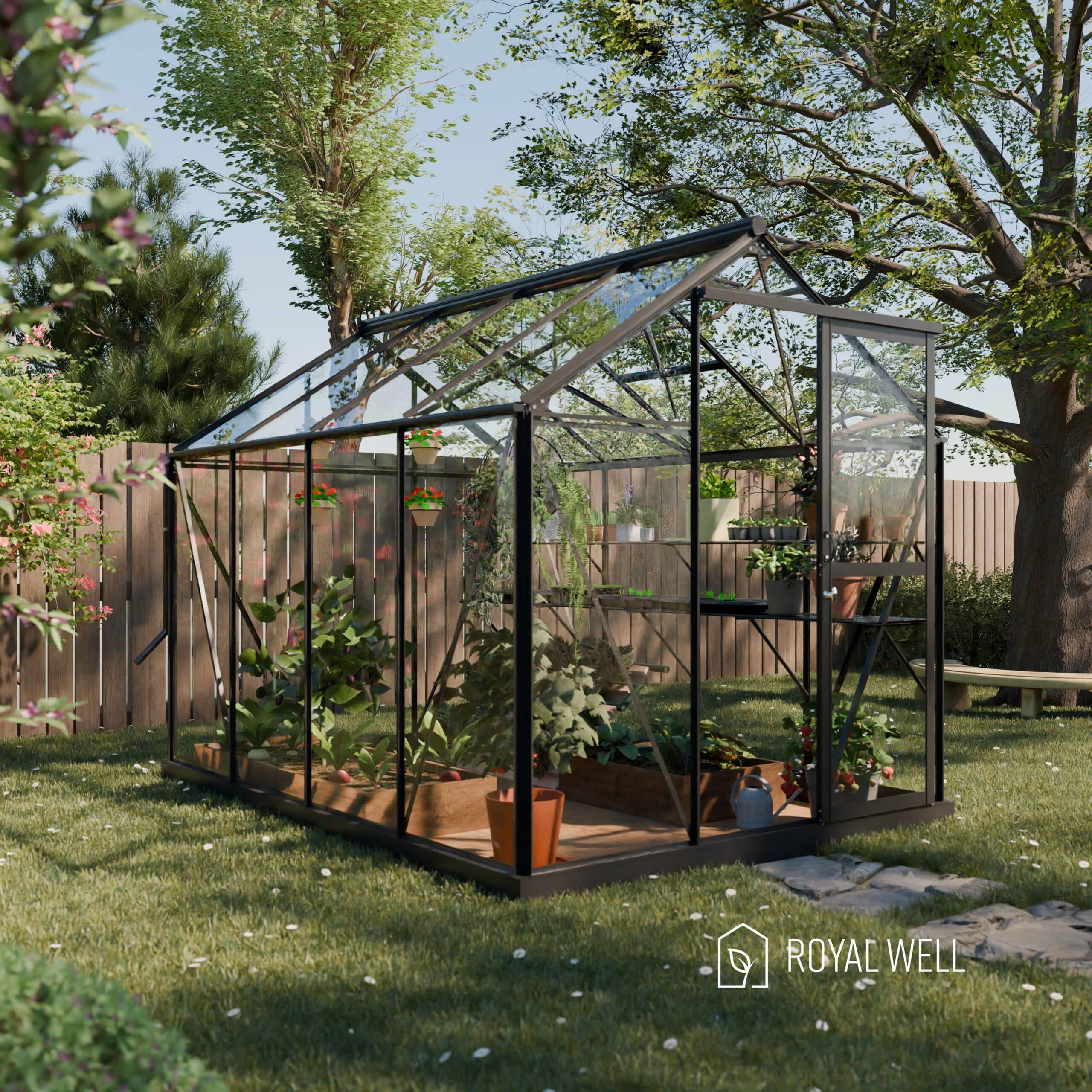 The Royal Well Mary II Black greenhouse is an elegant greenhouse that offers plenty of space not only for growing plants, but also for relaxing. This model, featuring a pitched roof and a single sliding door with a latch, combines functionality with style, and is perfect for anyone who loves gardening.