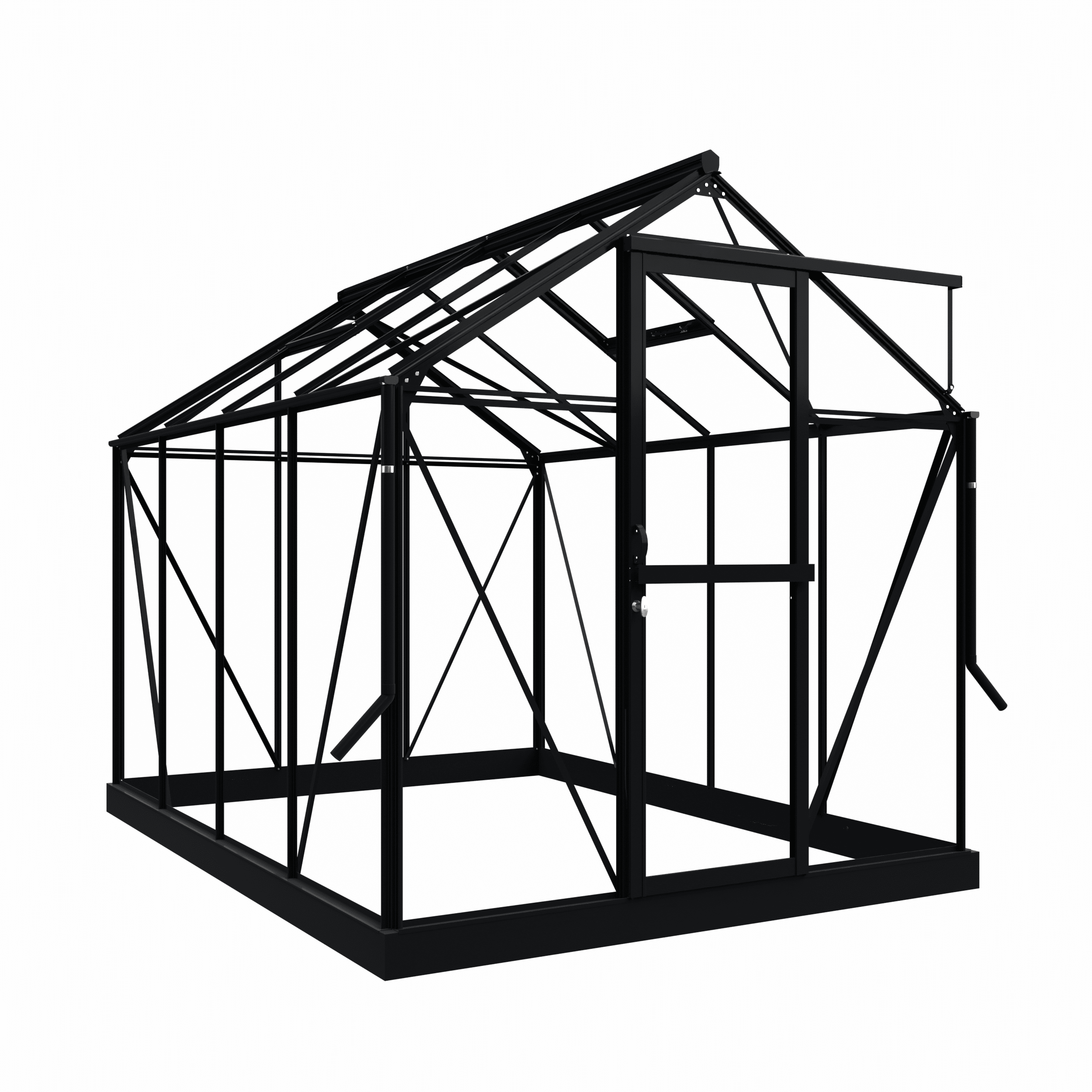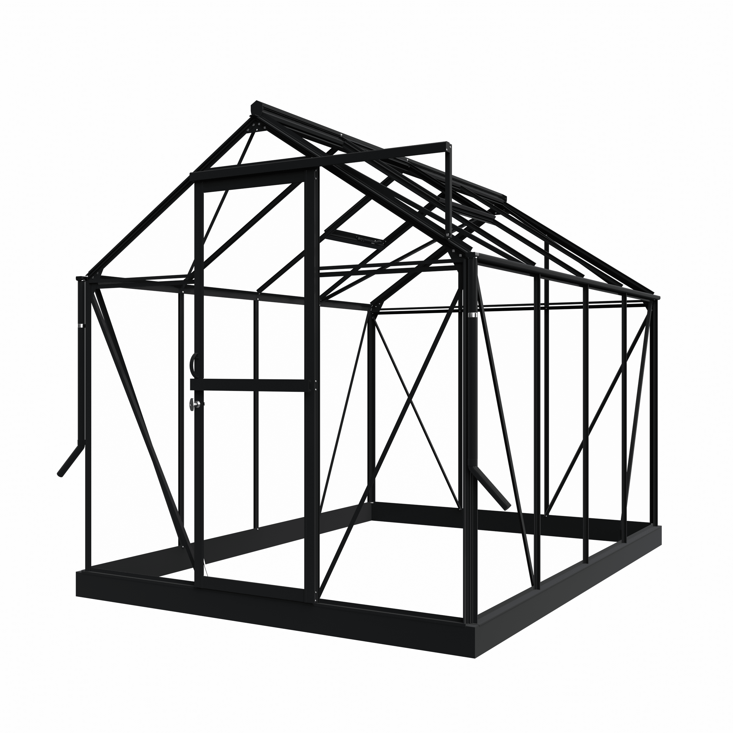 This greenhouse comes with a sturdy base (including ground anchors). Fixing materials are supplied as standard for securing the base to a stable surface (such as a tiled floor). To install the greenhouse on unpaved ground, use the supplied base anchors, which match the colour of the frame. The supplied base provides a stable foundation, suitable for both unpaved and paved surfaces.