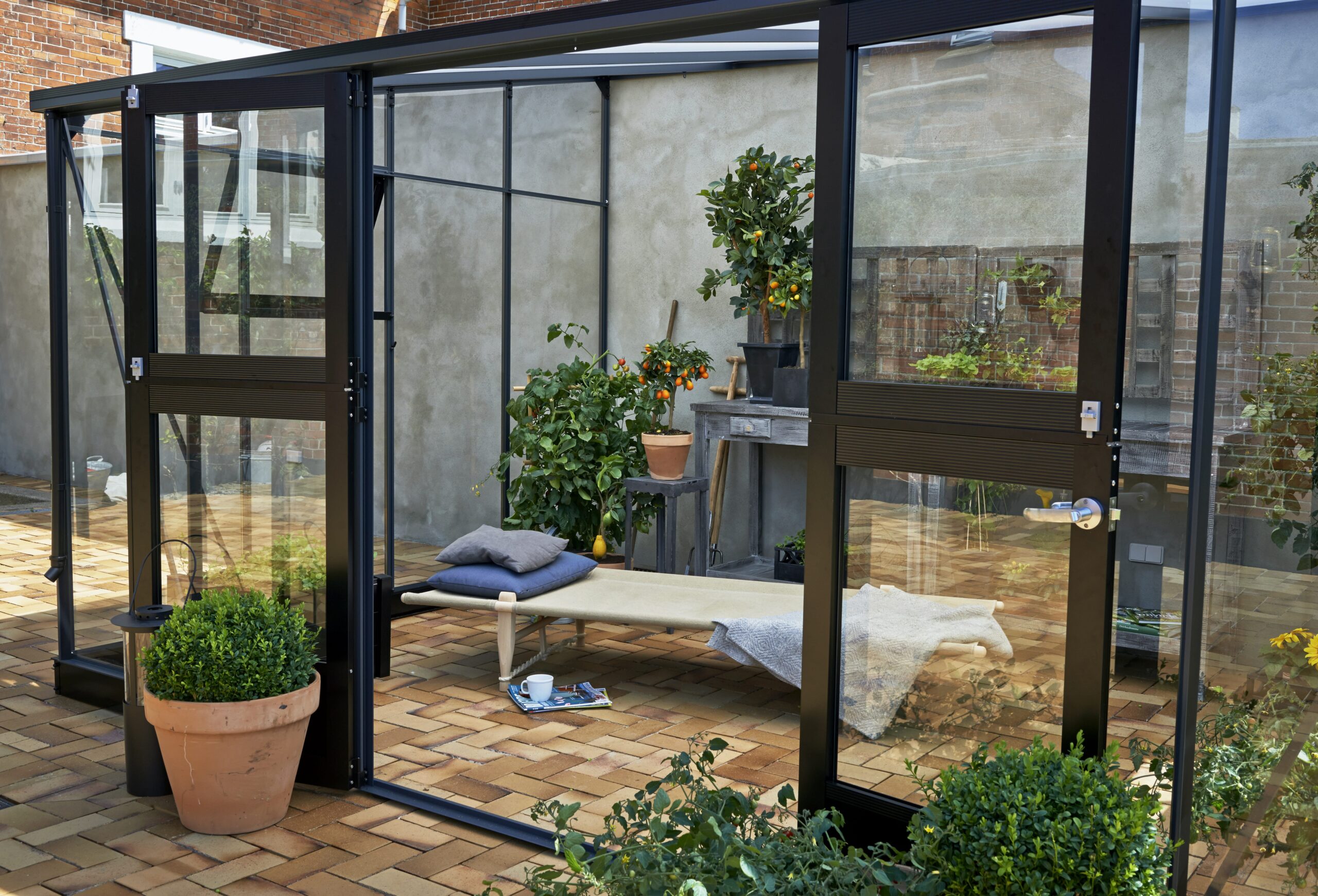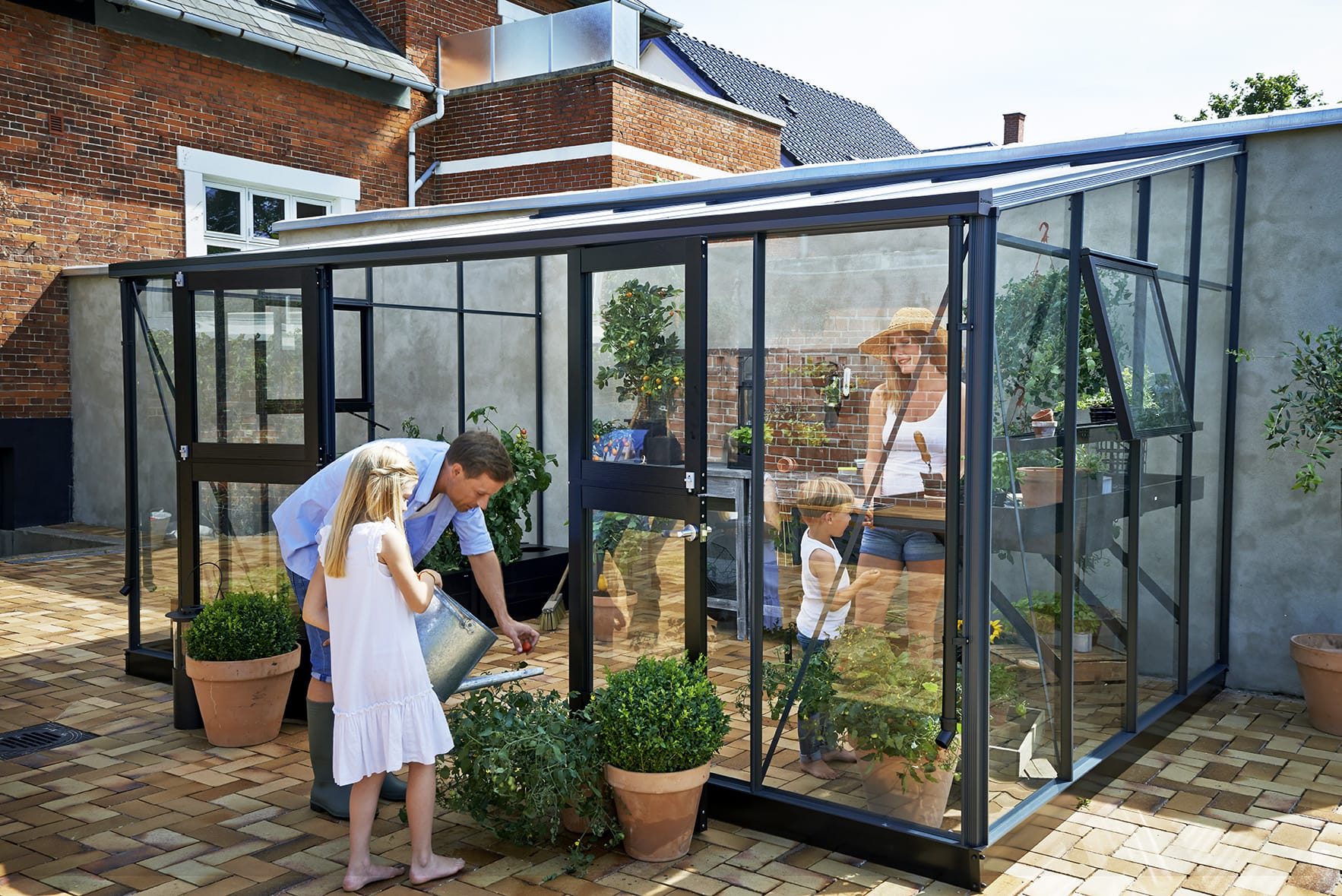 De Veranda 12,9 antracietgrijs gecoat is een muurmodel kas en een unieke samenstelling van optimaal gebruiksgemak, eigentijdse vormgeving en robuuste kwaliteit. Dit muurmodel is leverbaar in 3 verschillende maatvoeringen, met een oppervlakte van 4,4 m2 oplopend tot 12,8 m2 en stelt als enige voorwaarde een beschikbare en stevige muur. De solide aluminium constructie kan zowel in een blanke als antracietgrijs gecoate uitvoering worden geleverd. Specifieke frameonderdelen (deur, ramen, goten en de regenafvoer) worden standaard in zwarte kleur geleverd. Dit resulteert in een opvallend contrast. In afdichting wordt een combinatie gemaakt in 10 mm dubbelwandig licht wit polycarbonaat voor het dak met 3 mm dik veiligheidsglas in de zijwanden, vastgezet met antracietgrijze kliklijsten. Het licht witte polycarbonaat isoleert en zorgt voor diffuus licht in de kas, wat het verbranding van gewassen voorkomt. Uniek aan dit model is de deuren op de lengtezijde van de kas. Dankzij het verzonken dorpelprofiel en een dubbele deelbare scharnierdeur is de toegang tot de kas optimaal. De deuren hebben een roestvrij stalen deurbeslag inclusief slot met sleutel. Voor een goede beluchting is de kas voorzien van 2 zijvensterramen in de korte zijden van de kas en staldeuren. Het vrijhouden van de dakgoot van bijvoorbeeld blad is eenvoudig dankzij de scharnierende dakgootafsluiting. Deze gepatenteerde constructie is optimaal gebruiksvriendelijk en onderstreept het design van de kas. Voor de Veranda geldt dat de zwart gecoate stalen funderingsrand optioneel verkrijgbaar is. Het toepassen van een fundering op maat is noodzakelijk voor het goed laten functioneren en ondersteunen van de kas.