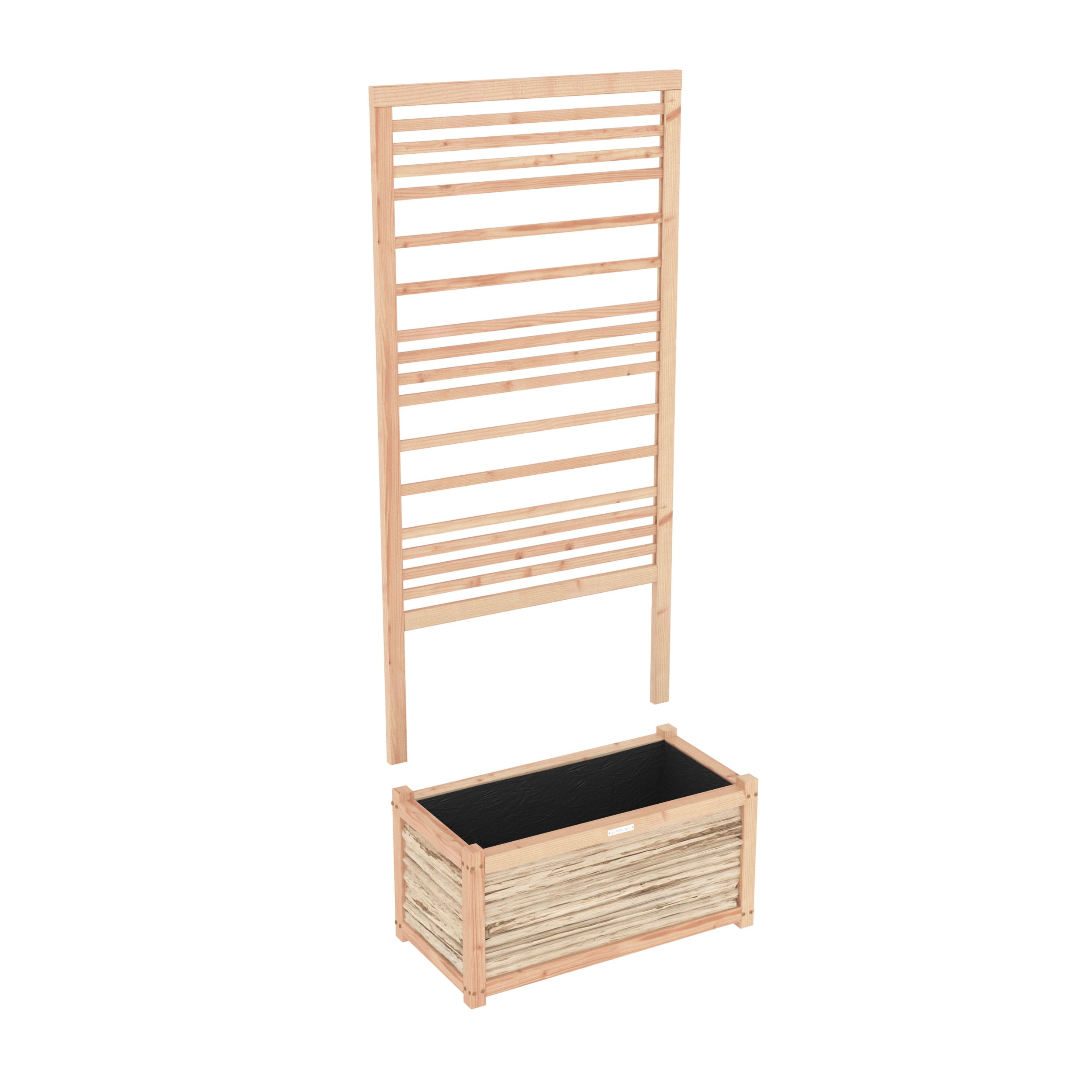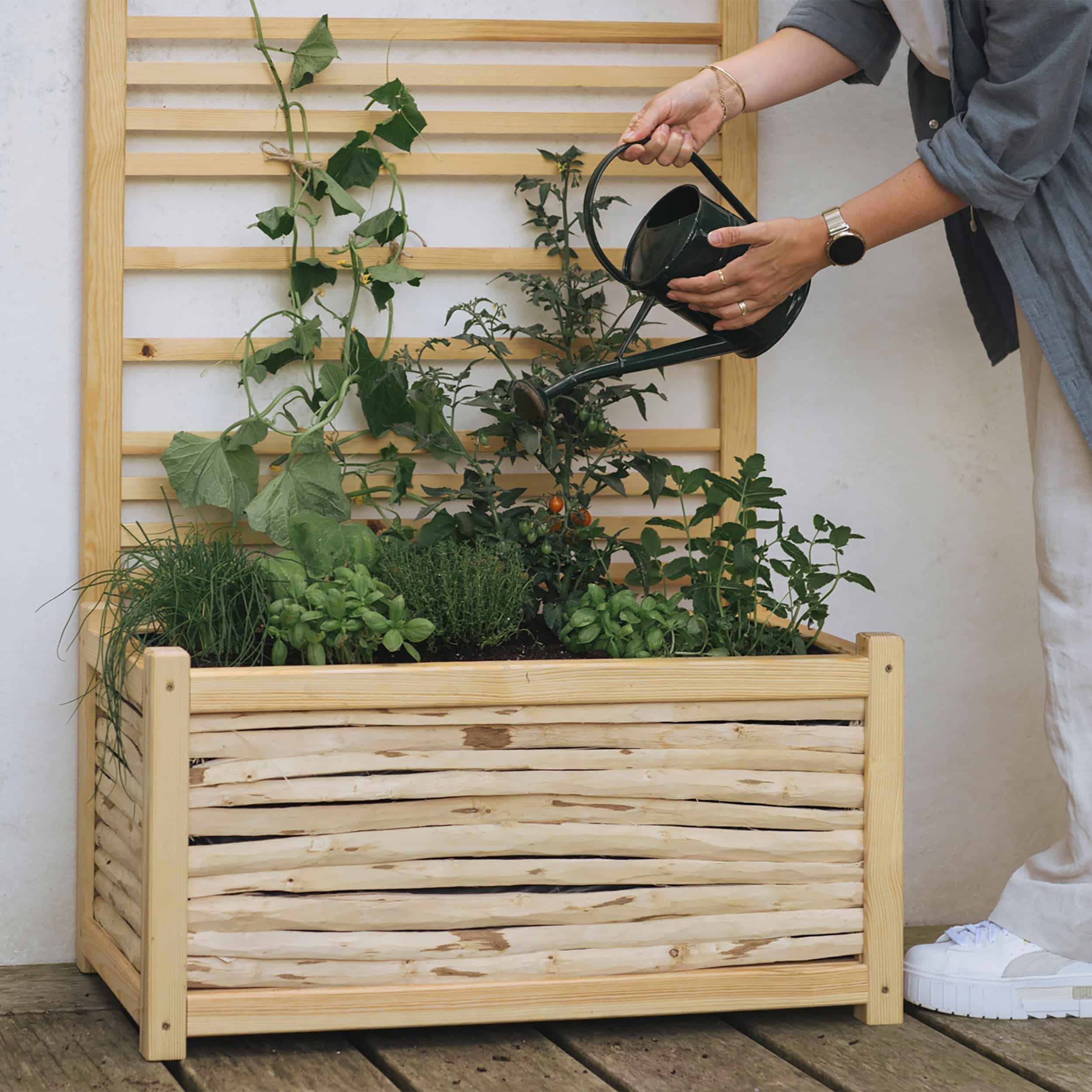 The Royal Well ‘Dominic’ pinewood planter is a sturdy and eye-catching planter with a matching trellis. The combination of the clear-varnished pinewood frame and the untreated hazelwood infill gives this striking piece a beautiful, contemporary and natural look. The sturdy wooden frame and matching trellis ensure years of enjoyment.