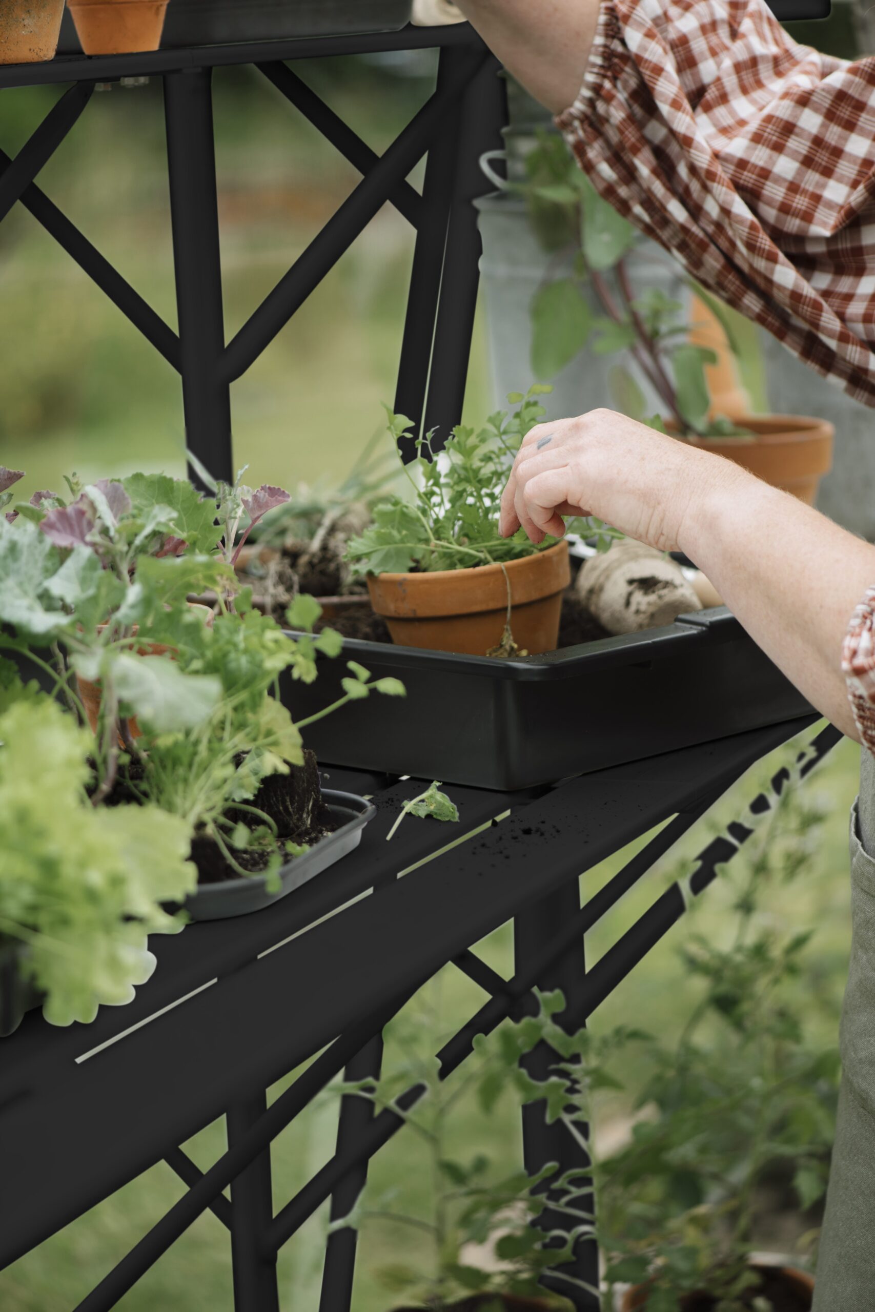De werktafels zijn beschikbaar in 2 secties en 3 secties breedte. Elk raam aan de zijkant is een sectie. In het geval van tuinkas Mary III zwart bestaat een werktafel set uit een kweektafel van 2 secties en een kweektafel van 3 secties breed.
