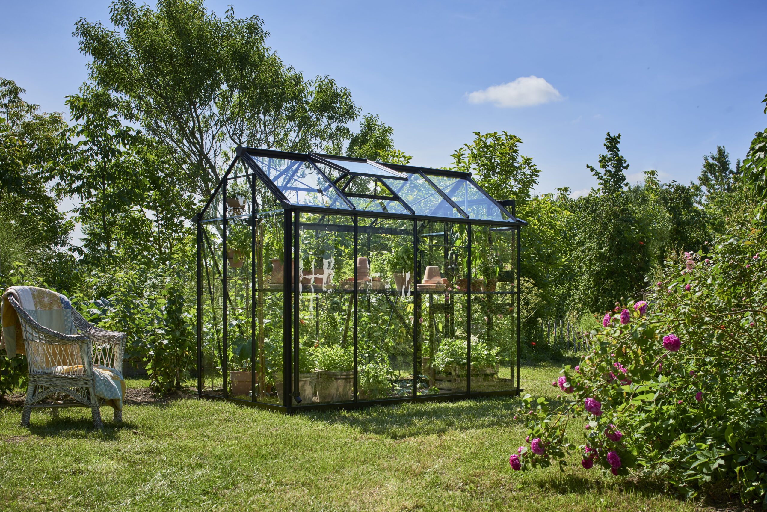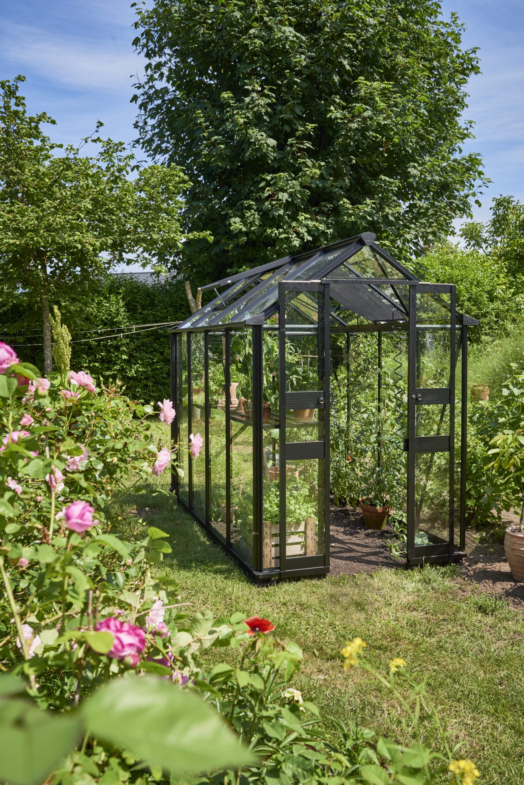 De Birdlip 48, zwart gecoat. Zoekt u een kleine tuinkas met stahoogte? Kies dan voor de Birdlip, de kleinste tuinkas ter wereld. Ondanks de kleine afmetingen is deze vrijstaande kas standaard uitgevoerd met een drempelloze dubbele schuifdeur met slot, 65 cm breed en een deurhoogte van maar liefst 187 cm. U gaat dus niet gebukt de kas in! Voor de extra brede goot met een breedte van 80 mm worden gratis 2 regenpijpen met een diameter van 40 mm meegeleverd. De Birdlip kas wordt geleverd met 3 mm dik veiligheidsglas. De afdichting wordt gefixeerd met kunststof beglazingsstrips. Het voordeel van veiligheidsglas: de ruiten worden geleverd in lange ruiten en tot 6 keer sterker dan tuindersglas en zeer duurzaam. Het frame van de Birdlip is standaard leverbaar in een blanke uitvoering. Voor een meer luxueuze uitstraling en / of eenheid met de omgeving waarin de kas wordt geplaatst is deze kas leverbaar in een zwarte of klassiek donkergroen gecoate uitvoering. Een goede beluchting is van levensbelang in de kas. Daarom is de Birdlip voorzien van 1 dakraam in model 44 en 2 dakramen in de twee grootste modellen; 46 en 48. Voor optimaal gebruiksgemak wordt het gebruik van een automatische raamopener geadviseerd. Deze raamopeners zijn temperatuurgevoelig en openen of sluiten het dakraam automatisch. Voor een stabiele en sterke basis is een funderingsrand noodzakelijk. De Birdlip wordt standaard (gratis) geleverd met een aluminium funderingsrand van 8 cm hoog. Indien u kiest voor een zwart of donkergroen gecoate kas wordt ook de fundering in deze kleur meegeleverd.