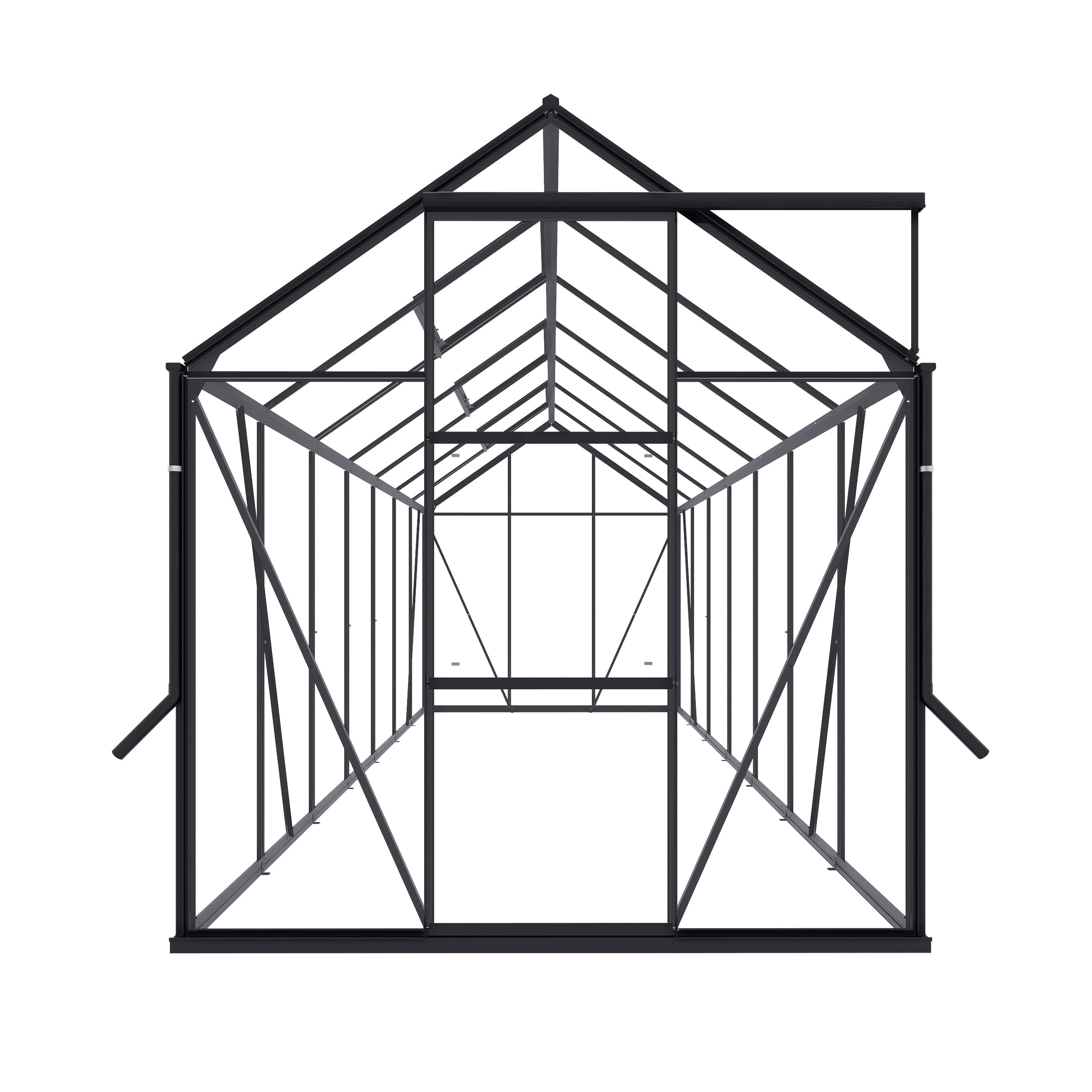 Deze kas is uitgevoerd in het zwart (RAL 9005) en heeft een oppervlakte van ca. 8,3 m2. Het 3 mm dikke veiligheidsglas wordt stevig bevestigd met dempend foamtape aan de binnenzijde. Aan de buitenzijde wordt het glas afgewerkt met PVC beglazingstrips. Deze zijn eenvoudig te installeren en uitgevoerd in de kleur van de profielen. De profielen hebben een elegante matte afwerking. Tuinkas Kate V is ook verkrijgbaar in de kleuren wit (RAL9010) en groengrijs (RAL7009).